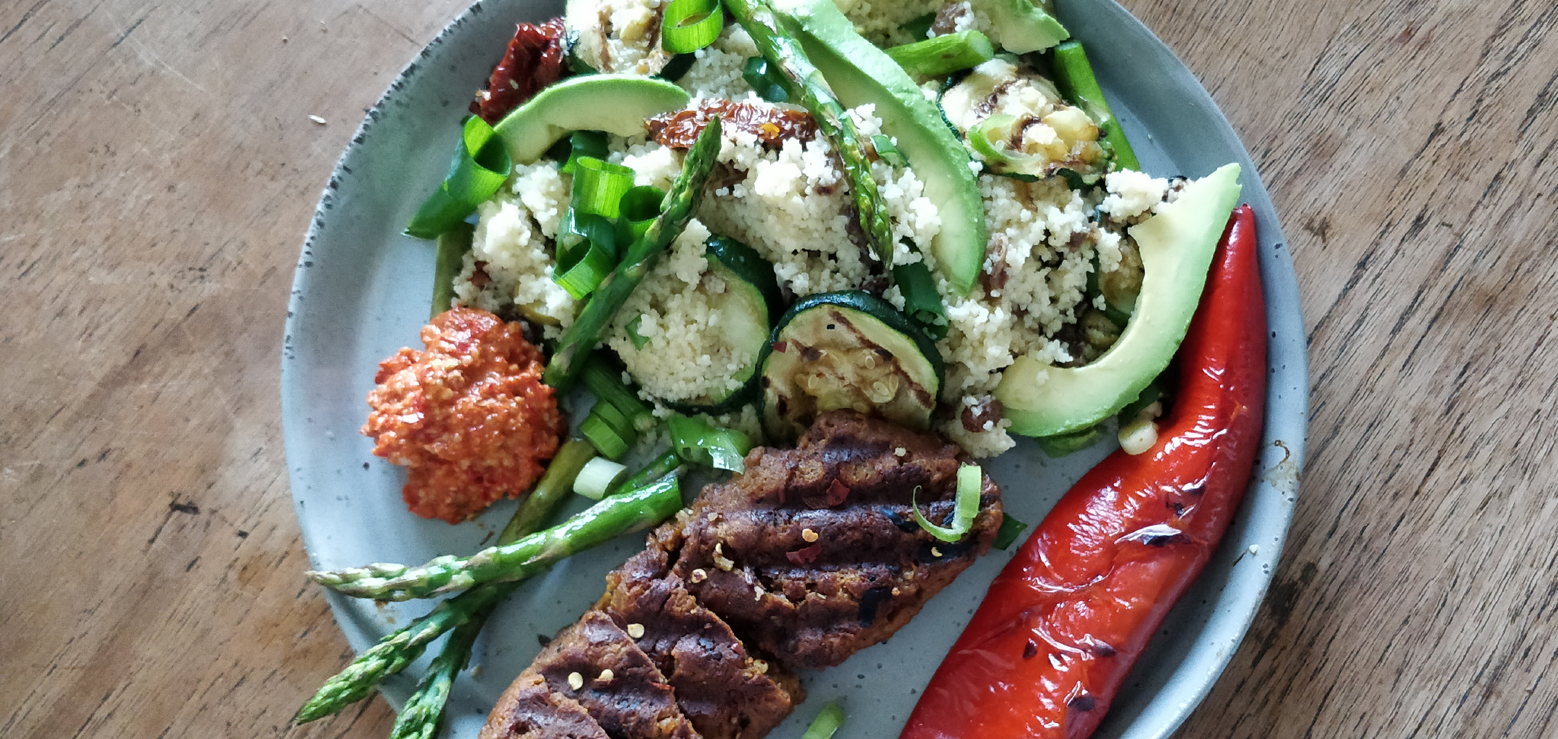 De vraag der vragen blijft natuurlijk ‘of je worst lust?’. En het antwoord daarop is uiteraard ja. En hoewel je best wel prima nepworst kunt kopen is zelf maken natuurlijk altijd beter. En welke worst is er nu beter om na te maken dat een lekker pittige Spaanse chorizo: rood, heet en lekker stevig! Als basis voor de worst gebruik ik in dit recept seitan, toch wel hetgeen wat de structuur van vlees vrij goed benadert. Goed gekruid en met wat rijst en maïzena voor de stevigheid plus sojasaus voor de umamismaak levert dan deze heerlijke vegan chorizo op. Ik at de chorizo samen met een lekkere coucoussalade met paprika, zongedroogde tomaat, gegrilde courgette en wat rozijnen; afgetopt met wat munt en pijnboompitten en geserveerd met heerlijke muhammara.