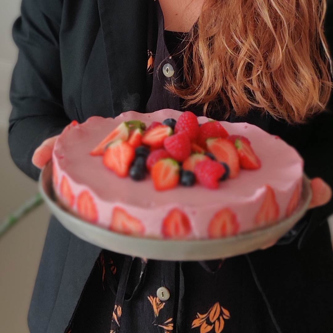 Maak de bodem door alle ingrediënten te mixen in een keukenmachine. Leg het bakpapier in de taartvorm en leg hier het deeg op. Druk goed aan en leg een halfuur in de koelkast. Warm vervolgens de bevroren aardbeien op in een pannetje en pureer eventueel met een staafmixer. Doe hier de agar-agar bij en roer goed door. Laat even afkoelen en giet hier de vegan yoghurt bij. Halveer ~200 gram van de verse aardbeien en leg tegen de rand van de bakvorm. Giet het aardbeien-yoghurtmengsel hier overheen. Zet 4 uur in de koelkast om op te stijven en serveer vervolgens met de verse aardbeien.