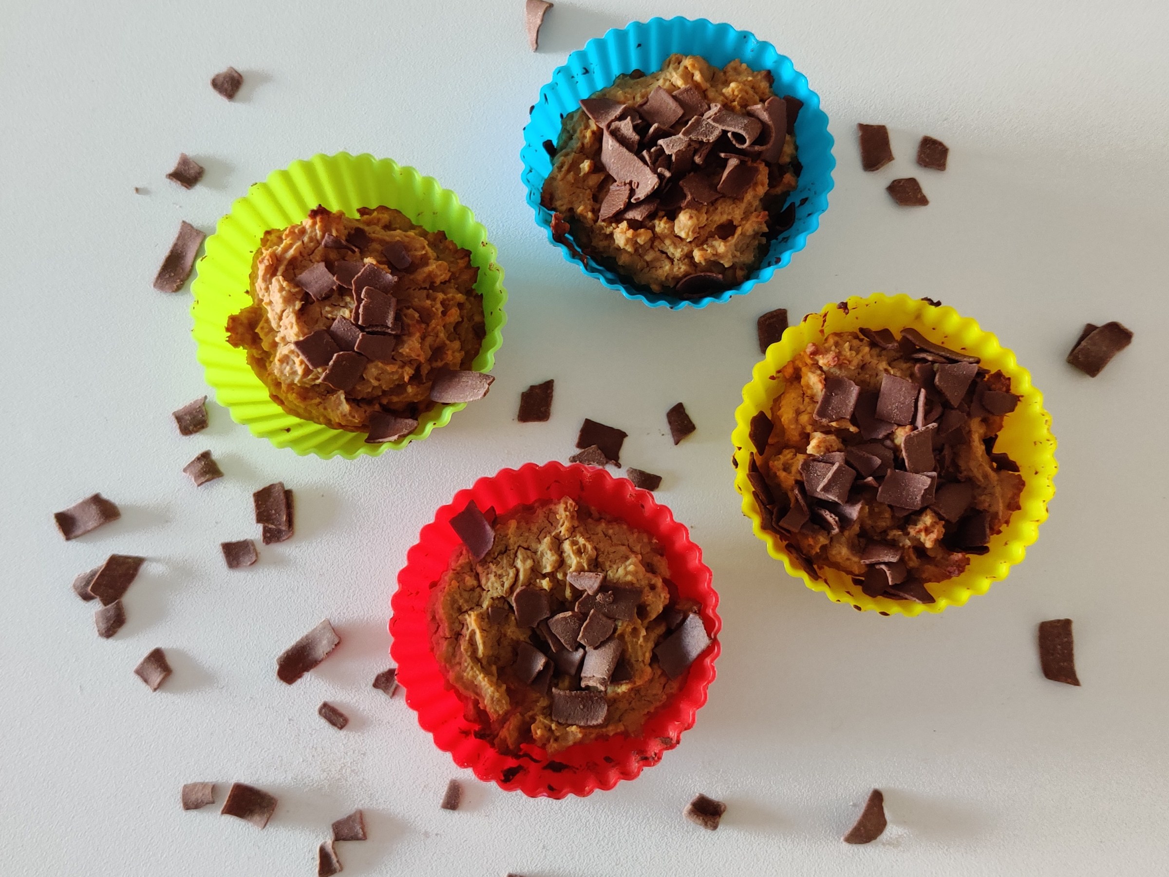 Doe alle ingrediënten behalve de vlokken/hagelslag/chocola in een kom en mix met een staafmixer tot een stevig deeg. Indien je stukje chocolade gebruikt, roer deze er dan doorheen. Gebruik je vlokken of hagelslag, houd deze dan apart. Verdeel het beslag over 4-5 vormpjes, of doe in een kleine cakevorm en zet 20-25 min in een voorverwarmde oven op 180 graden. Laat vervolgens een kwartier afkoelen en serveer met de hagelslag/vlokken.