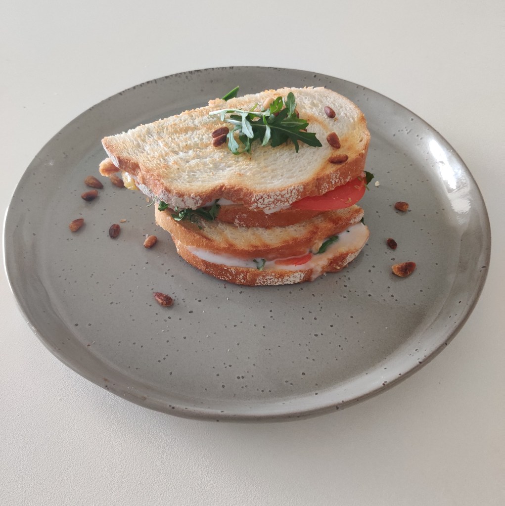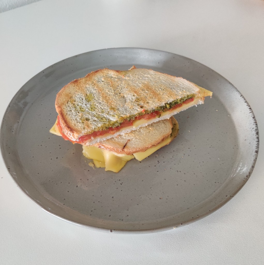 Besmeer een boterham met de pesto, leg hierop twee plakjes Violife, en de plakjes tomaat. Bedek met de tweede boterham. Besmeer eventueel de buitenkant met boter en verwarm in een grill of een koekenpan totdat de buitenkant goudbruin is en rooster daarop of -in ook de pijnboomputten. Snijd schuin doormidden, serveer met de pijnboompitten en eventueel wat verse basilicum en geniet.