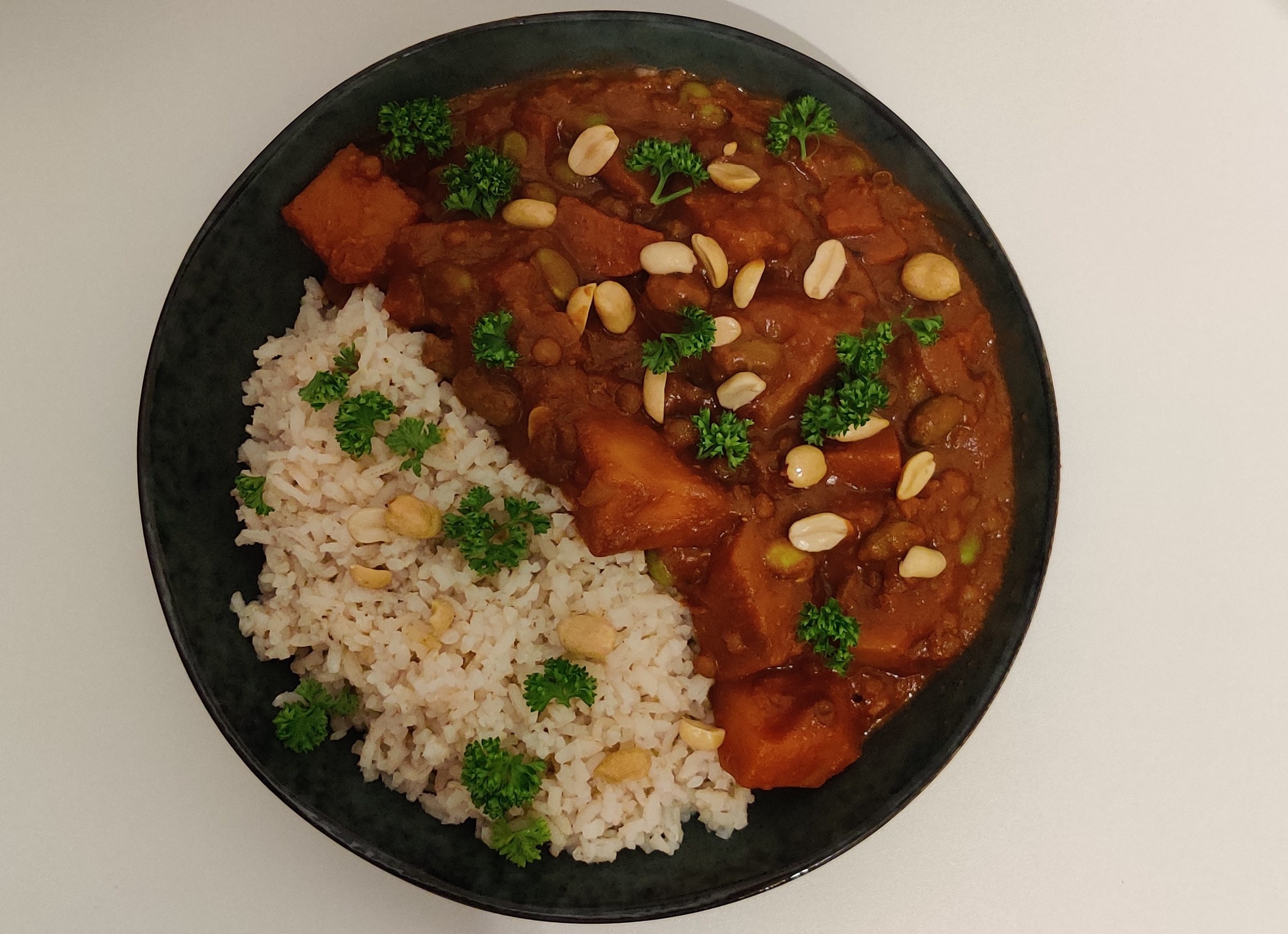 Pindakaas. Ik eet het eigenlijk elke dag. Heerlijk door de havermout, nog beter als satésaus. In dit recept wordt de pindakaas gecombineerd met pompoen tot een heerlijke stoofpot. Met flink wat bonen, dus een echte eiwit- én vezelbom. Aanrader!