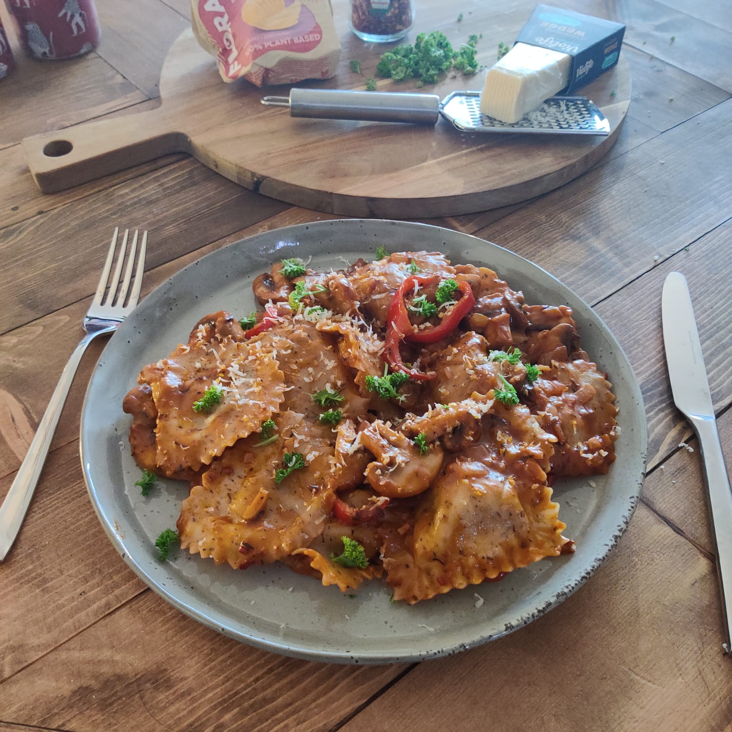 Volgende week (8 t/m 14 maart) is het de week zonder vlees. Nou eet ik überhaupt al een paar jaar geen vlees meer, maar het is wel een mooi moment om mensen bewust te maken van hoe je lekker vegetarisch of veganistisch kan eten. Ik mocht wat Flora plantbased ‘roomboter’ en Violife gebruiken van Green Food Lab om daar een lekker gerecht van te maken en dat is gelukt! Ik had zin in Italiaans, en daarom werd het een heerlijk dikke ragù. Een heerlijke dikke saus die lijkt op ragout, maar dan met tomatenpuree en rode wijn erbij. Samen met champignons gebakken in ‘roomboter’, chilivlokken, tijm en vegan ‘parmezaanse kaas’ is dit een absolute aanrader. Al zeg ik het zelf. Puur genieten dus.